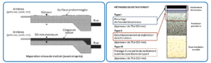 • Le recyclage de l’enrobé bitumineux (retraitement de type I) a pour but de réutiliser une épaisseur variable du revêtement existant, par le procédé de fraisage et enrobage à froid, en vue de créer une nouvelle couche de base. L’opération se réalise en fraisant la surface de la route et en malaxant le fraisât ainsi obtenu avec une émulsion de bitume modifié au polymère, avec ou sans ajouts de granulats d’apports, afin de constituer un nouveau pavage. Cette méthode offre la possibilité de rectifier le profil transversal et longitudinal de la chaussée.