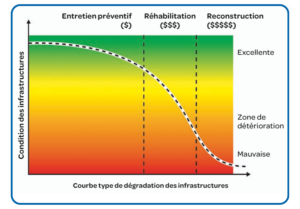 La dégradation normale des infrastructures progresse lentement au départ et s’accentue grandement à partir du moment où elle entre dans une zone de détérioration plus avancée. Au début de cette période, les coûts d’intervention, pour remettre les actifs en bon état, sont relativement bas. Par la suite, la condition se dégrade rapidement et les dépenses associées à la reconstruction sont environ cinq fois plus élevées.