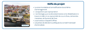 En matière de gestion des sols, deux gains environnementaux importants sont à noter. D’abord, le niveau des rives nord-ouest des rivières Magog et Saint-François, auparavant surélevé, a été abaissé par l’enlèvement de quelque 20 000 m3 de sols dans la zone inondable. Ces sols retirés ont pu être réutilisés dans le cadre dudit projet. Ultimement, l’objectif est d’en retirer un total d’environ 45 000 m3.